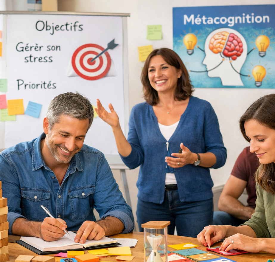 Très simplement, de manière ludique, nous abordons une nouvelle stratégie à chaque séance, par exemple l'organisation, la gestion du stress, ou encore, comment identifier l'essentiel… La séance démarre par une activité sans lien avec les milieux scolaires ou professionnels, pour prendre conscience de son propre fonctionnement, ce que l'on appelle la métacognition (Je m'observe en même temps que je fais une activité). Vient alors le temps de découvrir un outil simple que vous intégrerez dans votre quotidien. C'est la méthode des petits pas, pour changer progressivement d'habitude et devenir ainsi plus efficient. A la séance suivante, nous partagerons vos avancées, pour créer de l'émulation et encourager de nouvelles progressions.